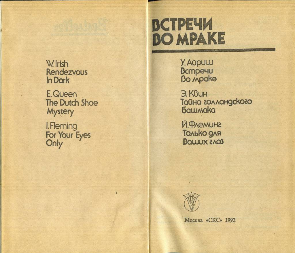 | Описание 1 | Американский писатель детективного жанра Уильям Айриш (Корнел Вулрич) представлен в сборнике остросюжетным романом "Встречи во мраке". Эллери Квин (литературный псевдоним писателей Фредерика Даннэя и Манфреда Ли) принадлежит роман "Тайна голландского башмака". Известный английский писатель Йен Флеминг знакомит читателя с пятью приключениями знаменитого агента 007 - Джеймса Бонда |