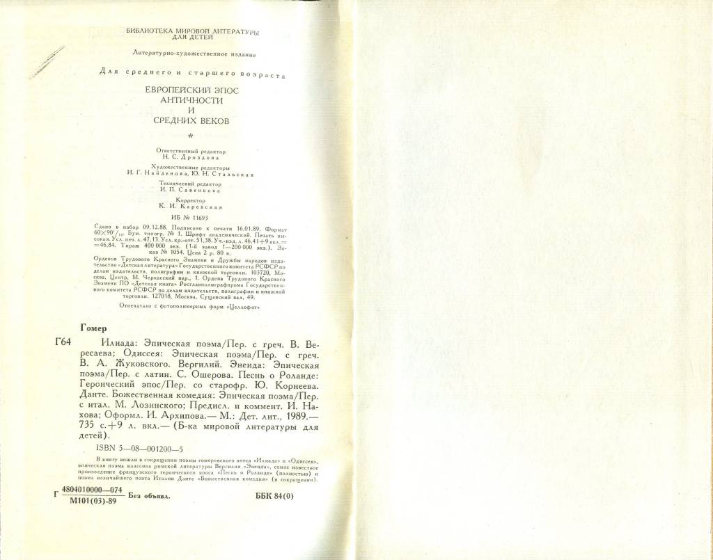 | Описание 1 | В том вошли в сокращении поэмы гомеровского эпоса "Илиада" и "Одиссея", эпическая поэма классика римской литературы Вергилия "Энеида", самое известное произведение французского героического эпоса "Песнь о Роланде" (полностью) и поэма величайшего поэта Италии Данте "Божественная комедия" (в сокращении). |
