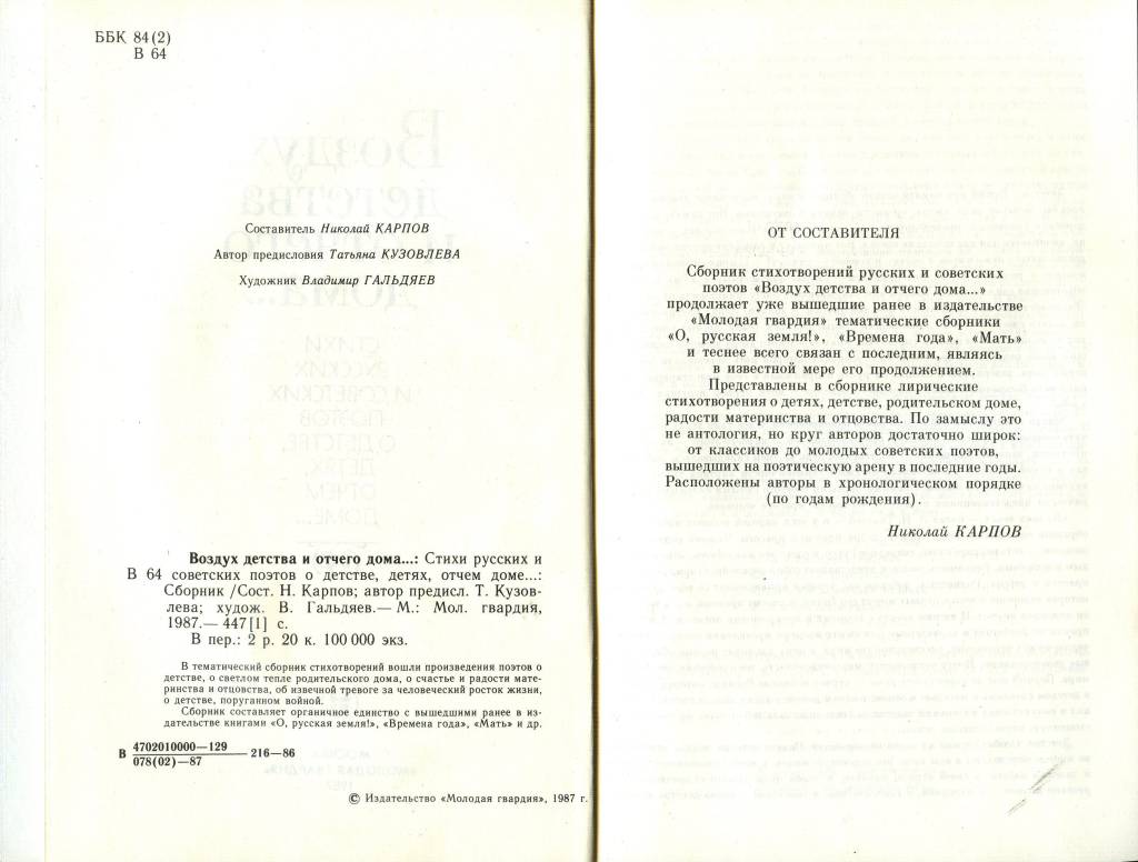 | Описание 1 | В тематический сборник стихотворений вошли произведения поэтов о детстве, о светлом тепле родительского дома, о счастье и радости материнства и отцовства, об извечной тревоге за человеческий росток жизни, о детстве, поруганном войной. Сборник составляет органичное единство с вышедшими ранее в издательстве книгами "О, русская земля!" |