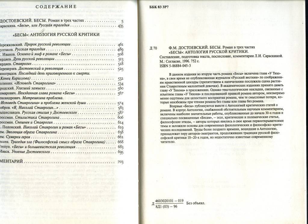 | Описание 1 | «Бесы» — один из самых важных романов Ф. М. Достоевского. Когда уже написаны были «Записки из Мертвого дома», «Записки из подполья», «Преступление и наказание» и «Идиот», Достоевский все еще испытывал острое чувство неудовлетворенности и, по собственному признанию, только подбирался к главному своему произведению, перед которым вся «прежняя литературная карьера — была только дрянь и введение». В процессе мучительно сложной работы над рукописью, злободневная книга, направленная против русского нигилизма, переросла в масштабный роман-трагедию, в котором и сегодня открываются новые философские, нравственные и исторические смыслы. Впервые "Бесы" публикуются вместе с Антологией критических статей о романе |